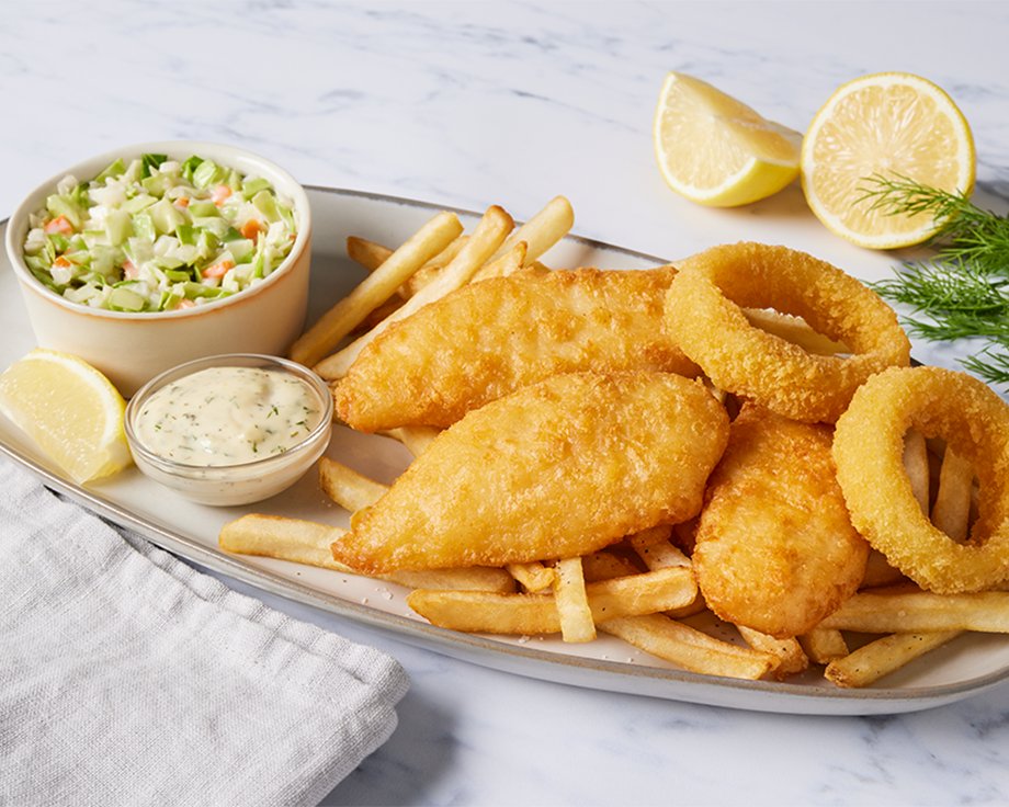 Five handbreaded chicken tenders served with your choice of dipping sauce, two sides and freshly baked bread.